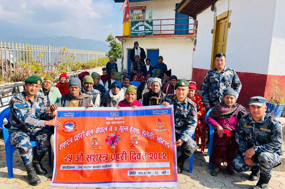 समाजमा जेष्ठ नागरिकप्रति सम्मान, सहकार्य र सुरक्षाको भावना अभिवृद्धि गर्ने उद्देश्यले सम्मान कार्यक्रम आयोजना गरिएको सशस्त्र प्रहरी बल नेपाल नं. ७ गुल्म, हलेसीका गुल्मपति सशस्त्र प्रहरी नायब उपरीक्षक शैलेन्द्र न्यौपानेले जानकारी दिनुभएको छ । जेष्ठ नागरिकहरु समाजका मार्गदर्शक तथा अनुभवी व्यक्तित्व भएकाले उनीहरूको स्वास्थ्य, सुरक्षा र सम्मानप्रति सशस्त्र प्रहरी बल सदैव संवेदनशील र प्रतिबद्ध रहेको गुल्मपति प्रनाउ न्यौपानेले बताउनुभएको छ ।